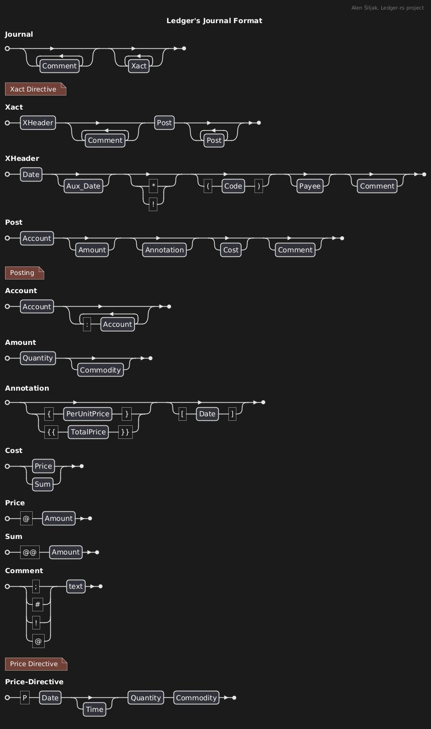 @startebnf title Ledger's Journal Format header Alen Šiljak, Ledger-rs project Journal = {Comment}, {Xact}; (* Xact Directive *) Xact = XHeader, {Comment}, Post, {Post}; XHeader = Date, [Aux_Date], ["*" | "!"], [("(", Code, ")")], [Payee], [Comment]; Post = Account, [Amount], [Annotation], [Cost], [Comment]; (* Posting *) Account = Account, {(":", Account)}; Amount = Quantity, [Commodity]; Annotation = [("{", PerUnitPrice, "}") | ("{{", TotalPrice, "}}")], [("[", Date, "]")]; Cost = Price | Sum; Price = ("@", Amount); Sum = ("@@", Amount); Comment = (";" | "#" | "!" | "@"), text ; (* Price Directive *) Price-Directive = "P", Date, [Time], Quantity, Commodity; @endebnf