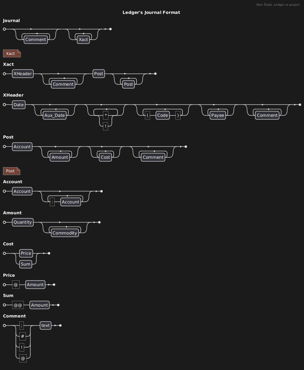 @startebnf title Ledger's Journal Format header Alen Šiljak, Ledger-rs project Journal = {Comment}, {Xact}; (* Xact *) Xact = XHeader, {Comment}, Post, {Post}; XHeader = Date, {Aux_Date}, {"*" | "!"}, {("(", Code, ")")}, {Payee}, {Comment}; Post = Account, {Amount}, {Cost}, {Comment}; (* Post *) Account = Account, {(":", Account)}; Amount = Quantity, {Commodity}; Cost = Price | Sum; Price = ("@", Amount); Sum = ("@@", Amount); Comment = (";" | "#" | "!" | "@"), text ; @endebnf