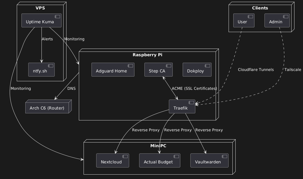 @startuml skinparam componentStyle uml2 node "Raspberry Pi" as rpi { [Adguard Home] as adguard [Step CA] as stepca [Dokploy] as dokploy [Traefik] as traefik } node "MiniPC" as minipc { [Vaultwarden] as vaultwarden [Nextcloud] as nextcloud [Actual Budget] as actual } node "VPS" as vps { [Uptime Kuma] as uptime [ntfy.sh] as ntfy } node "Arch C6 (Router)" as router node "Clients" as clients { [Admin] as admin [User] as user } rpi --> router : DNS stepca <--> traefik : ACME (SSL Certificates) traefik --> vaultwarden : Reverse Proxy traefik --> nextcloud : Reverse Proxy traefik --> actual : Reverse Proxy uptime --> rpi : Monitoring uptime --> minipc : Monitoring uptime --> ntfy : Alerts admin -..> traefik : Tailscale user -..> traefik : Cloudflare Tunnels @enduml