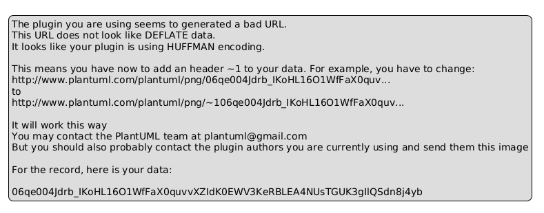 @startuml legend The plugin you are using seems to generated a bad URL. This URL does not look like DEFLATE data. It looks like your plugin is using HUFFMAN encoding. This means you have now to add an header ~1 to your data. For example, you have to change: http://www.plantuml.com/plantuml/png/06qe004Jdrb_IKoHL16O1WfFaX0quv... to http://www.plantuml.com/plantuml/png/~106qe004Jdrb_IKoHL16O1WfFaX0quv... It will work this way You may contact the PlantUML team at plantuml@gmail.com But you should also probably contact the plugin authors you are currently using and send them this image For the record, here is your data: 06qe004Jdrb_IKoHL16O1WfFaX0quvvXZIdK0EWV3KeRBLEA4NUsTGUK3gIlQSdn8j4yb endlegend @enduml
