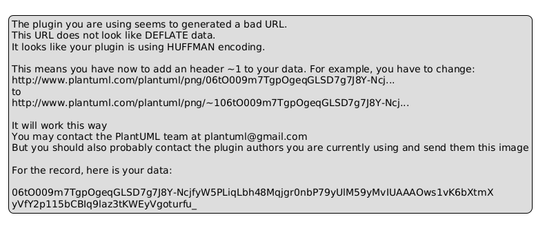 @startuml legend The plugin you are using seems to generated a bad URL. This URL does not look like DEFLATE data. It looks like your plugin is using HUFFMAN encoding. This means you have now to add an header ~1 to your data. For example, you have to change: http://www.plantuml.com/plantuml/png/06tO009m7TgpOgeqGLSD7g7J8Y-Ncj... to http://www.plantuml.com/plantuml/png/~106tO009m7TgpOgeqGLSD7g7J8Y-Ncj... It will work this way You may contact the PlantUML team at plantuml@gmail.com But you should also probably contact the plugin authors you are currently using and send them this image For the record, here is your data: 06tO009m7TgpOgeqGLSD7g7J8Y-NcjfyW5PLiqLbh48Mqjgr0nbP79yUlM59yMvIUAAAOws1vK6bXtmX yVfY2p115bCBIq9laz3tKWEyVgoturfu_ endlegend @enduml