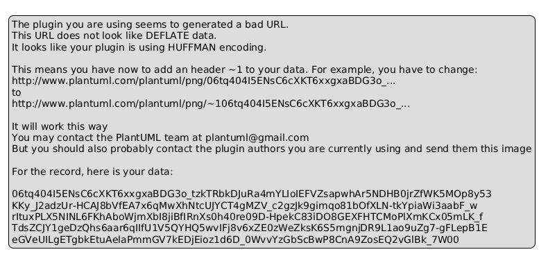 @startuml legend The plugin you are using seems to generated a bad URL. This URL does not look like DEFLATE data. It looks like your plugin is using HUFFMAN encoding. This means you have now to add an header ~1 to your data. For example, you have to change: http://www.plantuml.com/plantuml/png/06tq404I5ENsC6cXKT6xxgxaBDG3o_... to http://www.plantuml.com/plantuml/png/~106tq404I5ENsC6cXKT6xxgxaBDG3o_... It will work this way You may contact the PlantUML team at plantuml@gmail.com But you should also probably contact the plugin authors you are currently using and send them this image For the record, here is your data: 06tq404I5ENsC6cXKT6xxgxaBDG3o_tzkTRbkDJuRa4mYLIoIEFVZsapwhAr5NDHB0jrZfWK5MOp8y53 KKy_J2adzUr-HCAJ8bVfEA7x6qMwXhNtcUJYCT4gMZV_c2gzJk9gimqo81bOfXLN-tkYpiaWi3aabF_w rItuxPLX5NINL6FKhAboWjmXbI8jiBfIRnXs0h40re09D-HpekC83iDO8GEXFHTCMoPlXmKCx05mLK_f TdsZCJY1geDzQhs6aar6qIIfU1V5QYHQ5wvIFj8v6xZE0zWeZksK6S5mgnjDR9L1ao9uZg7-gFLepB1E eGVeUILgETgbkEtuAelaPmmGV7kEDjEioz1d6D_0WvvYzGbScBwP8CnA9ZosEQ2vGlBk_7W00 endlegend @enduml