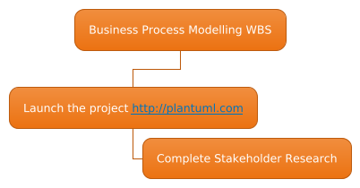 @startwbs !theme aws-orange * Business Process Modelling WBS ** Launch the project [[http://plantuml.com]] *** Complete Stakeholder Research @endwbs