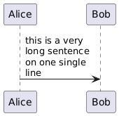 @startuml skinparam maxMessageSize 100 Alice -> Bob : this is a very long sentence on one single line @enduml