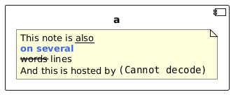 @startuml component "a" as a { note as N1 This note is <u>also</u> <b><color:royalBlue>on several</color> <s>words</s> lines And this is hosted by <img:sourceforge.jpg> end note } @enduml
