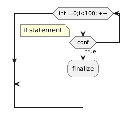 @startuml while(int i=0;i<100;i++) if ( conf ) then (true) note right if statement end note :finalize; break endif end while @enduml