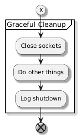 @startuml skinparam shadowing true (X) partition "Graceful Cleanup " { :Close sockets; :Do other things; :Log shutdown; } end @enduml