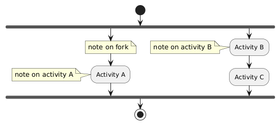 @startuml start fork note:note on fork :Activity A; note:note on activity A fork again :Activity B; note:note on activity B :Activity C; end fork stop @enduml