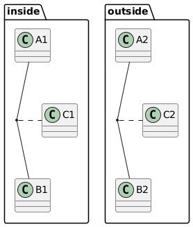 @startuml package inside { class A1 class B1 class C1 A1 -- B1 (A1, B1) . C1 } package outside { class A2 class B2 class C2 } A2 -- B2 (A2, B2) . C2 @enduml