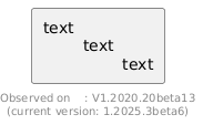 @startuml rectangle test_indent [ text \ttext \t\ttext ] footer Observed on : V1.2020.20beta13\n(current version: %version()) @enduml