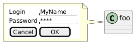 @startuml class foo note left {{ salt { Login | "MyName " Password | "**** " [Cancel] | [ OK ] } }} end note @enduml