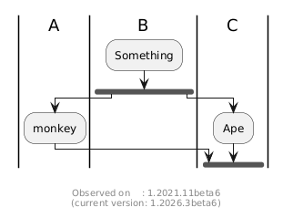 @startuml |A| |B| |C| |B| :Something; fork |A| :monkey; forkagain |C| :Ape; endfork footer \nObserved on : 1.2021.11beta6\n(current version: %version()) @enduml