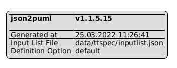 @startuml legend | <b>json2puml | <b>v1.1.5.15\n | | Generated at | 25.03.2022 11:26:41 | | Input List File | data/ttspec/inputlist.json | | Definition Option | default | end legend @enduml