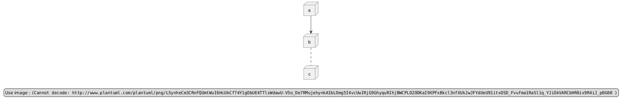 @startuml node a node b node c a --> b b .. c legend Use image : <img:http://www.plantuml.com/plantuml/png/LSynheCm3CRnFQUmtWuI6HcUkCf74Y1gObUE4TTlsWdawU-V5o_De7RMujehynkAIbLOmg5I4vcUwIRjG9GhyquRIhjBWCPLD2ODKaI9XPFxBkcl3nfXUkJwJFYdUeU91itxOSD_Fvufma1RaSl1q_YJiOkVARCbHR0ix9R4iJ_p0G00 > end legend @enduml