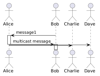 @startuml !pragma teoz true actor Alice actor Bob actor Charlie actor Dave Bob -> Alice ++: message1 Alice -> Bob & Dave & Charlie --++: multicast message @enduml