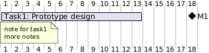 @startgantt [Task1: Prototype design] as [T1] lasts 13 days note bottom note for task1 more notes end note [M1] happens on 5 days after [T1]'s end [M1] displays on same row as [T1] @endgantt