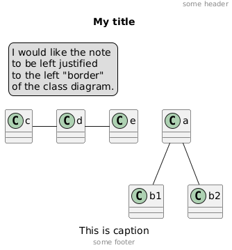 @startuml header some header footer some footer title My title caption This is caption legend top left I would like the note to be left justified to the left "border" of the class diagram. end legend a--b1 a--b2 c-d d-e @enduml