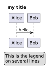 @startuml title my title legend This is the legend on several lines end legend Alice -> Bob : hello @enduml