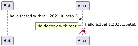 @startuml !pragma teoz true Bob -> Alice : hello tested with v 1.2021.01beta 3 Alice -> Alice: Hello actual %version() note left:No destroy with teoz destroy Alice @enduml