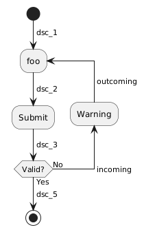 @startuml start ->dsc_1; repeat :foo; ->dsc_2; :Submit; ->dsc_3; (->incoming) backward :Warning; (->outcoming) repeat while (Valid?) is (No) not (Yes) ->dsc_5; stop @enduml