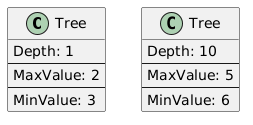 @startuml !procedure $tree($d, $max, $min) class "Tree" as tree-$d-$max-$min { Depth: $d -- MaxValue: $max -- MinValue: $min } !endprocedure $tree(1,2,3) $tree(10,5,6) @enduml