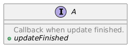 @startuml !define COMMENT(x) <color:grey>x</color> interface A { {method} COMMENT(Callback when update finished.) + {abstract} updateFinished() } @enduml