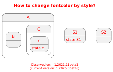 @startuml <style> root { FontColor Red } </style> title How to change fontcolor by style? state A { state B { } state C { state c : state c } } state S1 : state S1 state S2 footer \nObserved on: 1.2021.11beta2\n(current version: %version()) @enduml