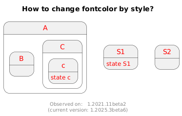 @startuml <style> stateDiagram { FontColor Red } </style> title How to change fontcolor by style? state A { state B { } state C { state c : state c } } state S1 : state S1 state S2 footer \nObserved on: 1.2021.11beta2\n(current version: %version()) @enduml