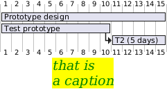 @startgantt <style> caption { HorizontalAlignment left FontName Serif FontSize 19 FontColor green FontStyle italic BackGroundColor yellow } </style> [Prototype design] lasts 15 days [Test prototype] lasts 10 days then [T2 (5 days)] lasts 5 days caption that is a caption end caption @endgantt