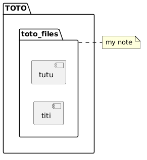 @startuml left to right direction Note "my note" as My_Note package "TOTO" { folder "toto_files" as t_files{ [titi] [tutu] } } t_files .. My_Note @enduml