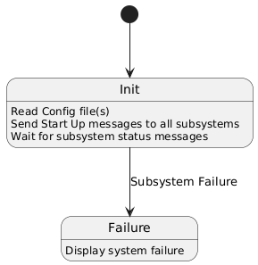 @startuml [*] --> Init Init : Read Config file(s) Init : Send Start Up messages to all subsystems Init : Wait for subsystem status messages Init --> Failure : Subsystem Failure Failure : Display system failure @enduml