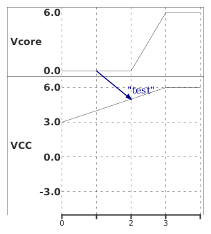 @startuml analog "Vcore" as VDD analog "VCC" between -4.5 and 6.5 as VCC VCC ticks num on multiple 3 VCC is 200 pixels height @0 VDD is 0 VCC is 3 @2 VDD is 0 @3 VDD is 6 VCC is 6 VDD@1 -> VCC@2 : "test" @enduml