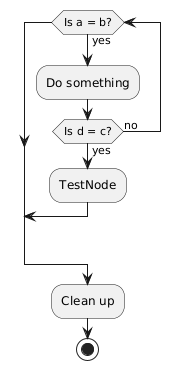 @startuml while(Is a = b?) is (yes) :Do something; if(Is d = c?) then (yes) :TestNode; break else (no) endif endwhile :Clean up; stop @enduml