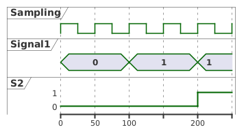 @startuml clock "Sampling" as SClk with period 50 concise "Signal1" as S1 robust S2 @0 S1 is 0 S2 is 0 @100 S1 is 1 @200 S1 is 1 S2 is 1 @enduml