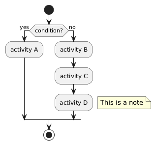 @startuml skinparam ConditionEndStyle hline start if (condition?) then (yes) :activity A; else (no) :activity B; :activity C; :activity D; floating note right: This is a note endif stop @enduml
