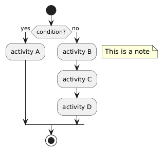 @startuml skinparam ConditionEndStyle hline start if (condition?) then (yes) :activity A; else (no) :activity B; floating note right: This is a note :activity C; :activity D; endif stop @enduml