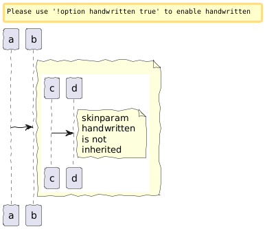 @startuml skinparam handwritten true a->b note right {{ c->d note right skinparam handwritten is not inherited end note }} end note @enduml