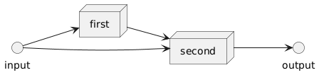 @startuml left to right direction interface input interface output node first node second first --> second input --> first input --> second second --> output @enduml