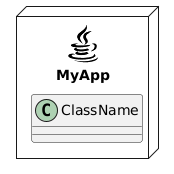 @startuml !define SPRITESURL https://raw.githubusercontent.com/rabelenda/cicon-plantuml-sprites/v1.0/sprites !includeurl SPRITESURL/java.puml node MyApp <<$java>> { class ClassName } @enduml