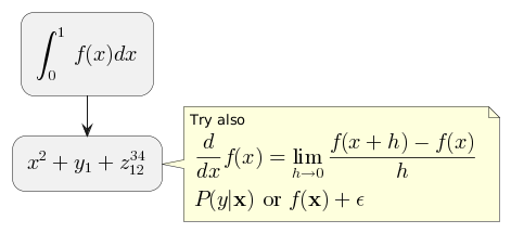 @startuml :<latex>\int_0^1f(x)dx</latex>; :<latex>x^2+y_1+z_{12}^{34}</latex>; note right Try also <latex>\dfrac{d}{dx}f(x)=\lim\limits_{h \to 0}\dfrac{f(x+h)-f(x)}{h}</latex> <latex>P(y|\mathbf{x}) \mbox{ or } f(\mathbf{x})+\epsilon</latex> end note @enduml