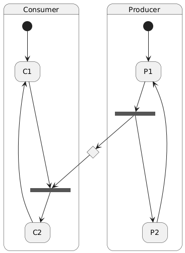 @startuml hide empty description state Producer { state P1 state fork1 <<fork>> state P2 [*] --> P1 } state choice1 <<choice>> state Consumer { state C1 state C2 state fork2 <<fork>> [*] --> C1 } P1 --> fork1 fork1 ----> P2 fork1 --> choice1 P2 -u---> P1 C1 ----> fork2 choice1 --> fork2 fork2 --> C2 C2 -u---> C1 @enduml
