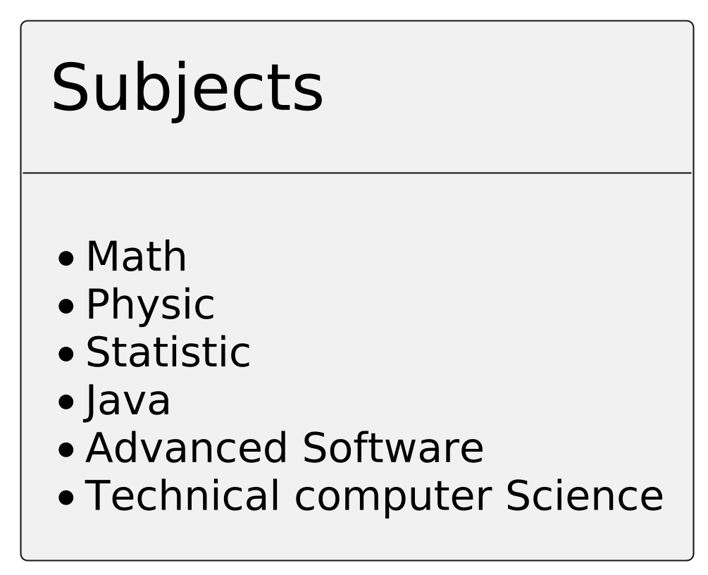 @startuml /' scale max 1800*900 '/ skinparam dpi 400 skinparam shadowing false skinparam backgroundcolor transparent skinparam caption { FontColor #00518C } rectangle "<size:22>Subjects</size>\n<size:1>\n____\n<size:1></size>\n* Math\n* Physic\n* Statistic\n* Java\n* Advanced Software\n* Technical computer Science"{ } @enduml