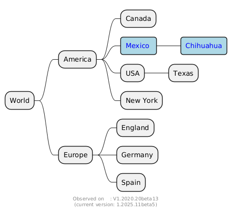 @startmindmap <style> .mexicoStyle * { BackgroundColor lightblue FontColor Blue RoundCorner 10 } </style> * World ** America *** Canada *** Mexico <<mexicoStyle>> **** Chihuahua *** USA **** Texas *** New York ** Europe *** England *** Germany *** Spain footer Observed on : V1.2020.20beta13\n(current version: %version()) @endmindmap