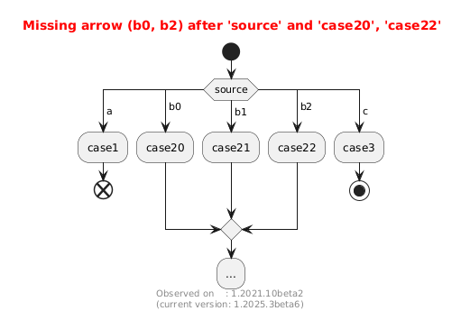 @startuml title <color:red> Missing arrow (b0, b2) after 'source' and 'case20', 'case22' start switch (source) case ( a ) :case1; end case ( b0 ) :case20; case ( b1 ) :case21; case ( b2 ) :case22; case ( c ) :case3; stop endswitch :...; footer Observed on : 1.2021.10beta2\n(current version: %version()) @enduml