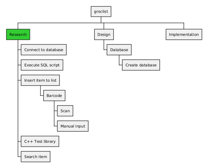 @startwbs * groclist **[#limegreen] Research ***> Connect to database ***> Execute SQL script ***> Insert item to list ****> Barcode *****> Scan *****> Manual input ***> C++ Test library ***> Search item ** Design ***> Database ****> Create database ** Implementation @endwbs
