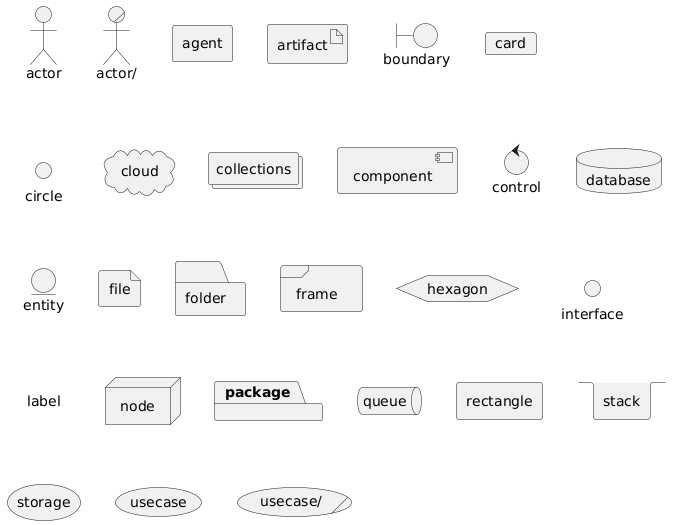 @startuml actor actor actor/ "actor/" agent agent artifact artifact boundary boundary card card circle circle cloud cloud collections collections component component control control database database entity entity file file folder folder frame frame hexagon hexagon interface interface label label node node package package queue queue rectangle rectangle stack stack storage storage usecase usecase usecase/ "usecase/" @enduml