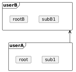 @startuml skinparam defaultTextAlignment center frame userA{ card root card sub1 } frame userB{ card rootB card subB1 } userA -up-> userB @enduml