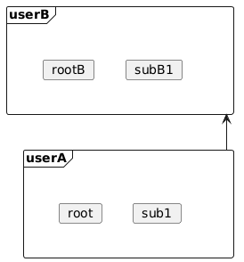@startuml 'skinparam defaultTextAlignment center frame userA { label userA [ {{ card root card sub1 }} ] } frame userB { label userB [ {{ card rootB card subB1 }} ] } userA -up-> userB @enduml