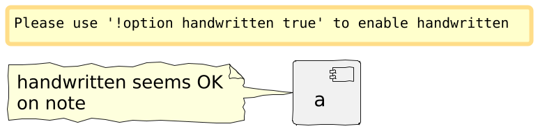 @startuml scale 2 skinparam handwritten true component a { } note left of a handwritten seems OK on note end note @enduml