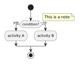 @startuml skinparam ConditionEndStyle hline start if (condition?) then (yes) :activity A; else (no) :activity B; endif floating note right: This is a note stop @enduml
